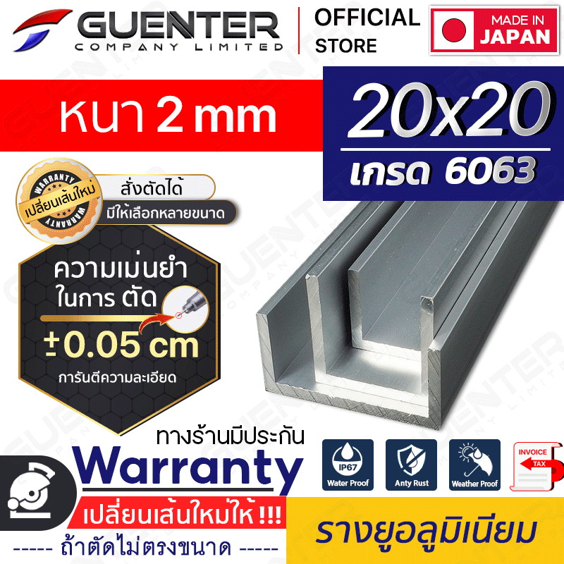 รางยูอลูมิเนียม 20×20 หนา 2 mm เกรด 6063 ความยาว 4 เมตร
