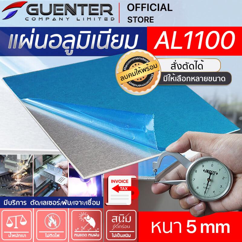 Aluminum Sheet หรือ แผ่นอลูมิเนียม 5 mm เกรด AL1100 พร้อมเคลือบฟิล์ม PE กันรอยให้ 1 ด้าน สามารถพับขึ้นรูปได้ดี เนื้อเหนียว มีความมันเงาไม่เป็นสนิม มีน้ำหนักเบากว่าแผ่นอลูมิเนียม AL5083 แต่ไม่เหมาะกับการชุบสีอโนไดร์ เหมาะสำหรับทำเครื่องครัว ทำแผ่นปูโต๊ะทำงาน งานตับพับขึ้นรูปได้ดี ชิ้นงานในอุสาหกรรมต่างๆ และสามารถสั่งตัดได้ตามขนาดที่ต้องการ